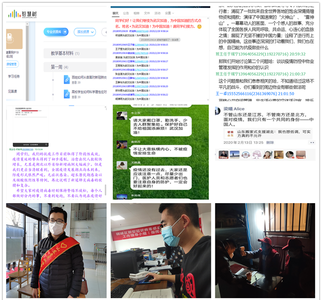 党员教师、班主任、辅导员等借助“智慧树”、微信、QQ群课堂等平台围绕防疫相关知识、大学生的使命与担当、致敬逆行者等设计了诸多话题讨论,弘扬爱国主义教育和理想信念教育,引导学生的树立爱国、担当精神,树立专业行业自信心,鼓励学生用实际行动支持打赢疫情防控阻击战。