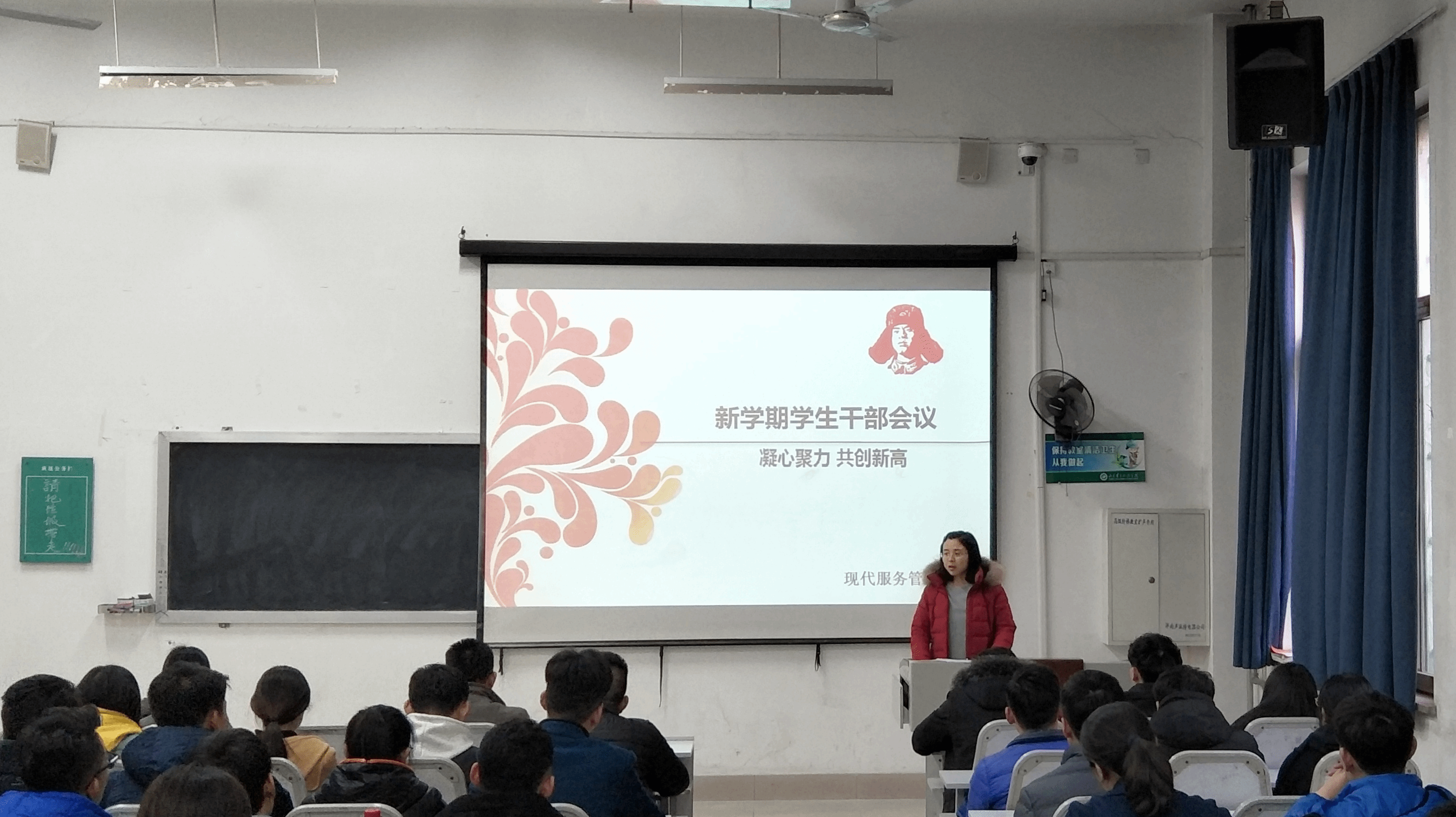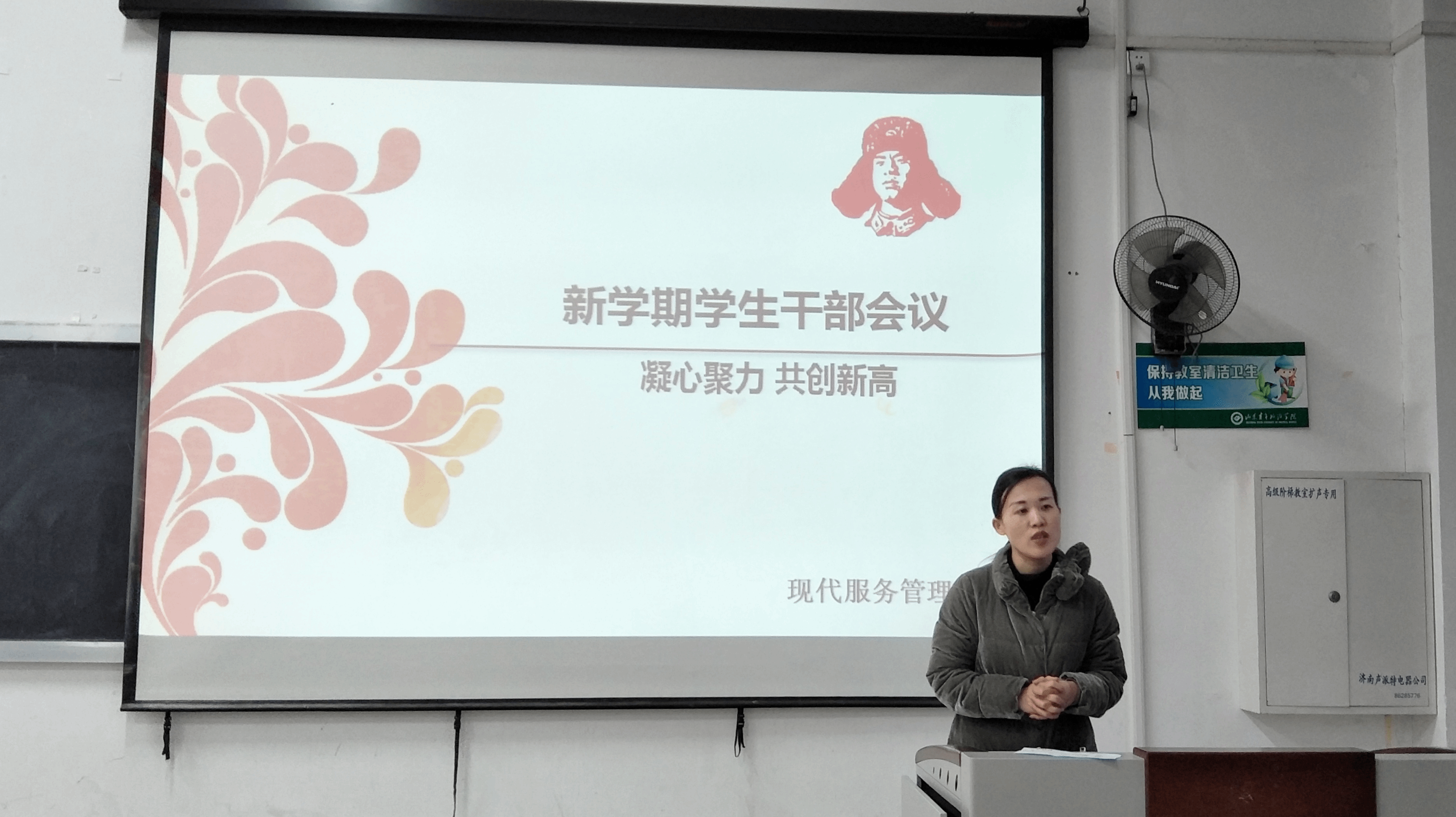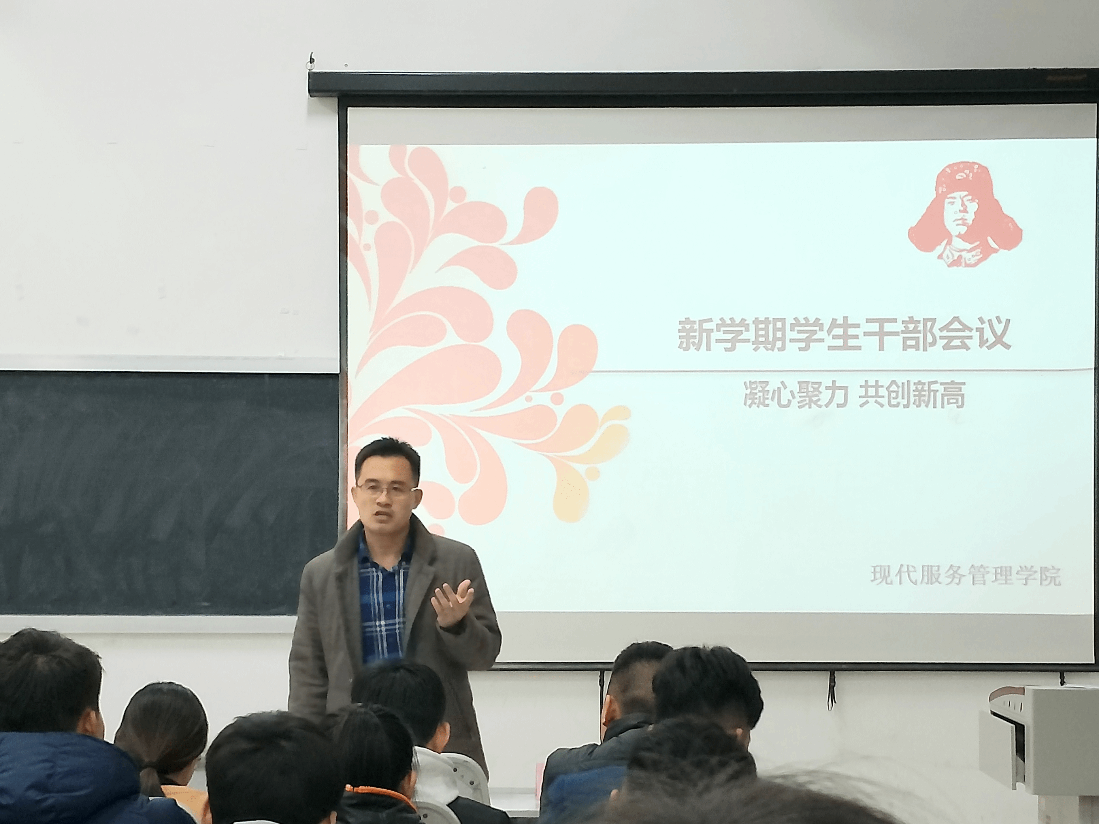 为增强学生干部凝聚力,提高新学院综合发展能力,新学期伊始,现代服务管理学院举办了“凝心聚力,共创新高”为主题的新学期学生干部会议。学院党总支副书记韩相伟、团总支书记窦玉明、辅导员侯菲菲以及学院全体学生党员、学生会副部长及以上、各班团支书班长参加了此次会议。会议由侯菲菲老师主持。