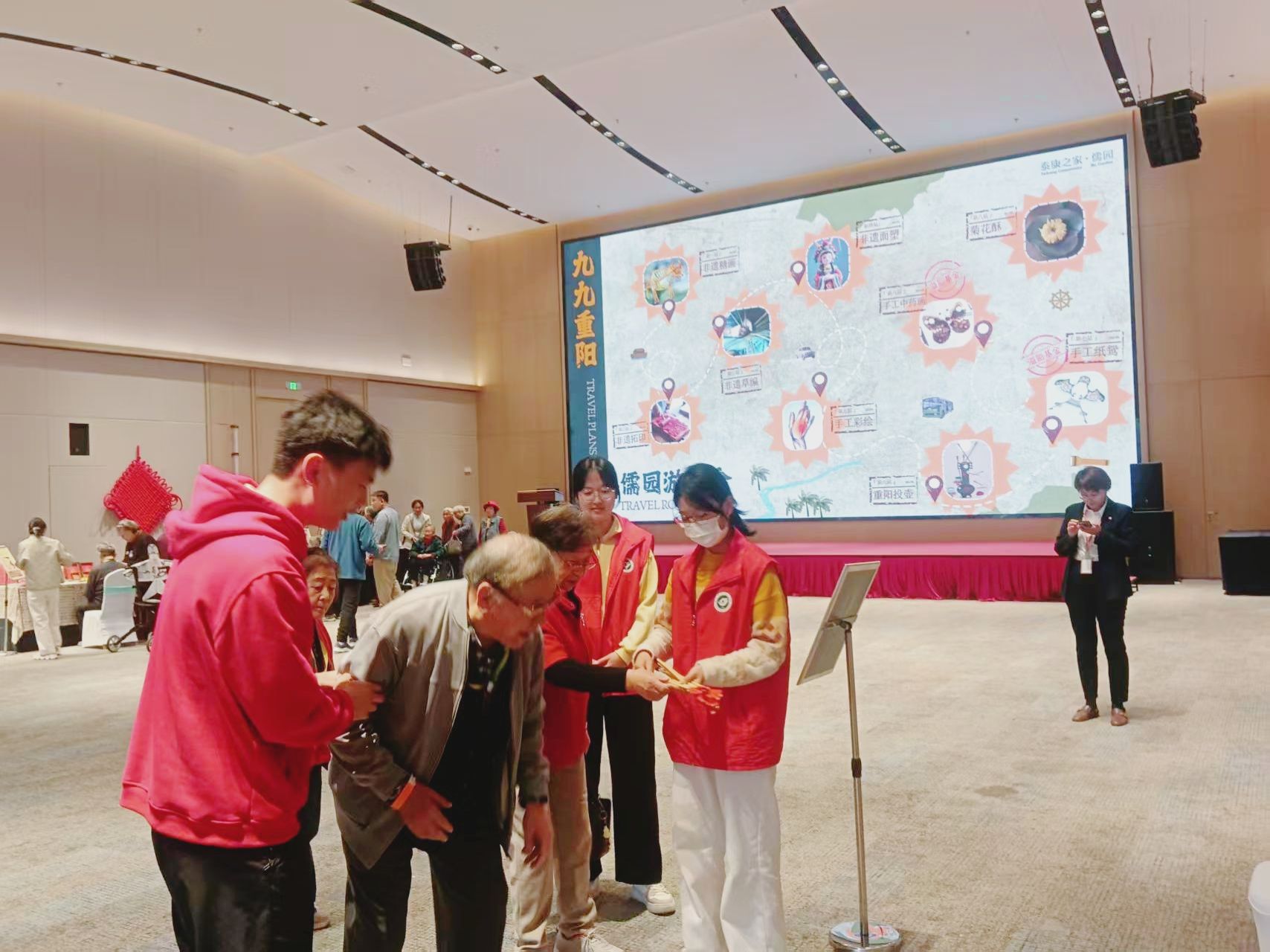 温情实践:用专业服务点亮暖心韶光。游园会现场,志愿者们将专业素养融入温馨服务,以实际行动诠释敬老内涵。签到处,同学们笑脸相迎,为长者递上集章游园卡和寓意安康的茱萸香囊;开场环节,他们悉心引导长者入座,协助完成太极表演,营造庄重温馨的仪式氛围。各活动区域精彩纷呈:投壶、套圈等适老游戏兼顾趣味与安全,志愿者全程守护,贴心搀扶;书法区内,老少携手挥毫,共书“寿”字传递祝福;美食区精心准备了软糯可口的重阳糕、清香怡人的菊花茶等传统美食,严格执行分餐制,守护长者饮食健康。在“回忆分享会”上,年轻学子俯身倾听,用心记录,以真诚对话搭建起跨越年龄的心灵桥梁。细致服务赢得长者们连连称赞:“这些孩子不仅贴心,还懂我们老人的心思,比亲人还周到!”