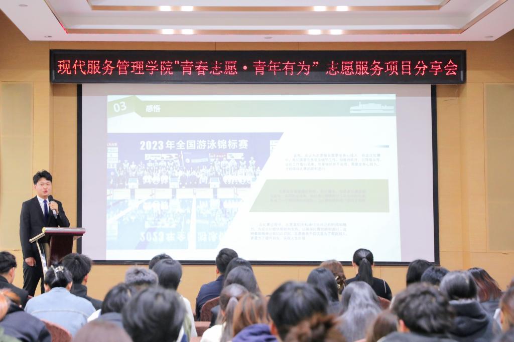 弘扬雷锋精神,以实践强本领。为激励广大学生在实践中淬炼思想、明责思为,学院举办“青春志愿·青年有为”志愿服务项目分享会。赵立霖、刘振雪、刘华宇3名学生围绕选拔动员、岗位培训、服务过程与收获等问题,对第七届中国非物质文化遗产博览会、2023年全国游泳锦标赛等大型赛会志愿服务进行细致讲解和分享。现场气氛热烈,掌声不断。分享会激发了学生勇于奉献、积极作为的热情与动力,大家纷纷表示将努力提升专业素养和实践能力,在服务社会、奉献社会中勇担时代使命。