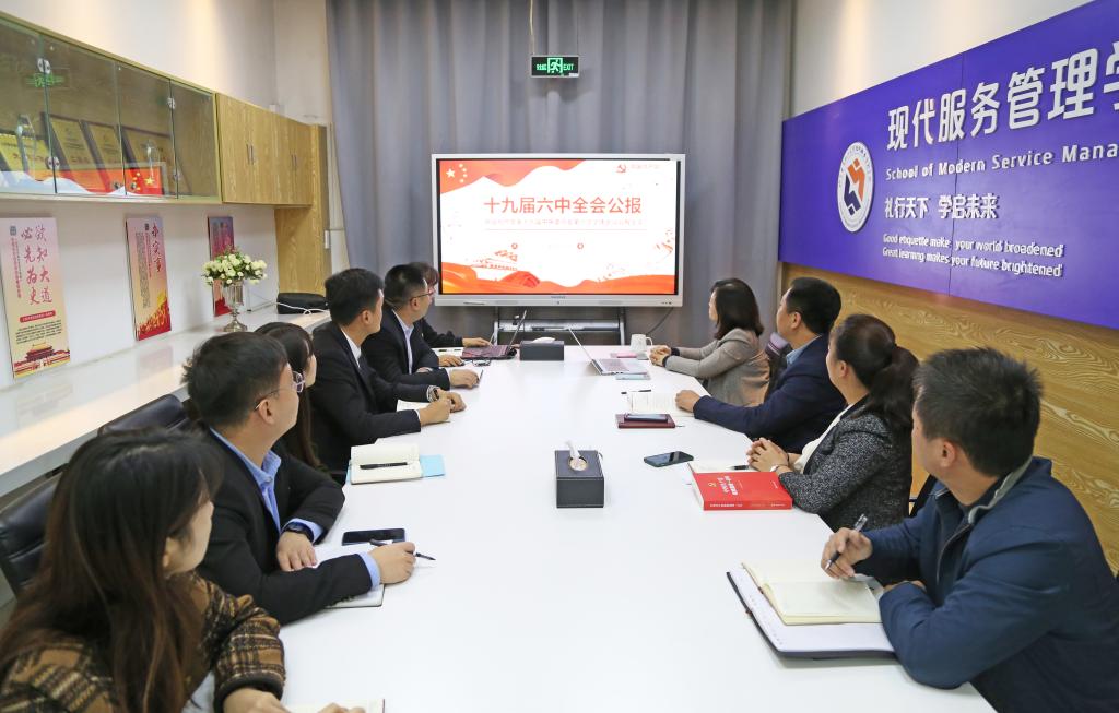 11月18日,现代服务管理学院党委理论学习中心组(扩大)会议,学习传达党的十九届六中全会精神,理论学习中心组成员、全体党支部书记参加会议。