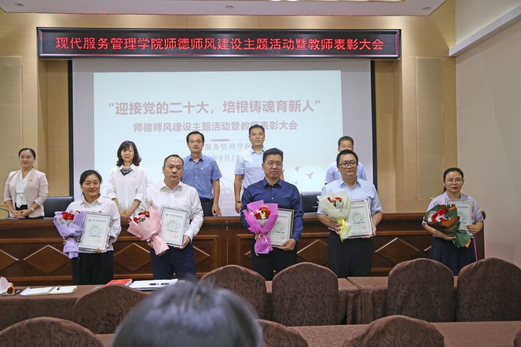 为深入学习贯彻习近平总书记在省部级主要领导干部研讨班上的重要讲话精神,持续加强新时代教师师德师风建设,团结凝聚学院全体教职工更好担负起立德树人根本任务,切实提升教师思想政治素质和职业道德水平,9月15日,现代服务管理学院在礼行楼303召开师德师风建设主题活动暨教师表彰大会。学校党委委员、宣传部部长蒋涛涛及现代服务管理学院全体教职工出席会议。