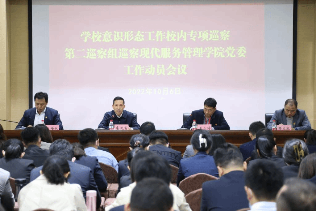根据学校关于意识形态工作校内专项巡察工作的统一部署,10月6日下午,学校第二巡察组巡察现代服务管理学院党委意识形态工作动员会在礼行楼303会议室召开。学校党委委员、纪委书记、省监委驻学校监察专员、巡察工作领导小组副组长崔连富,第二巡察组组长王三海及其他成员出席会议,现代服务管理学院全体教师参加动员会。会议由现代服务管理学院党委书记衣海永主持。