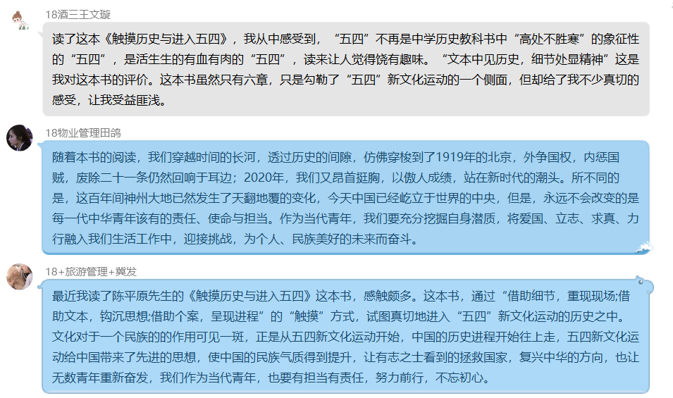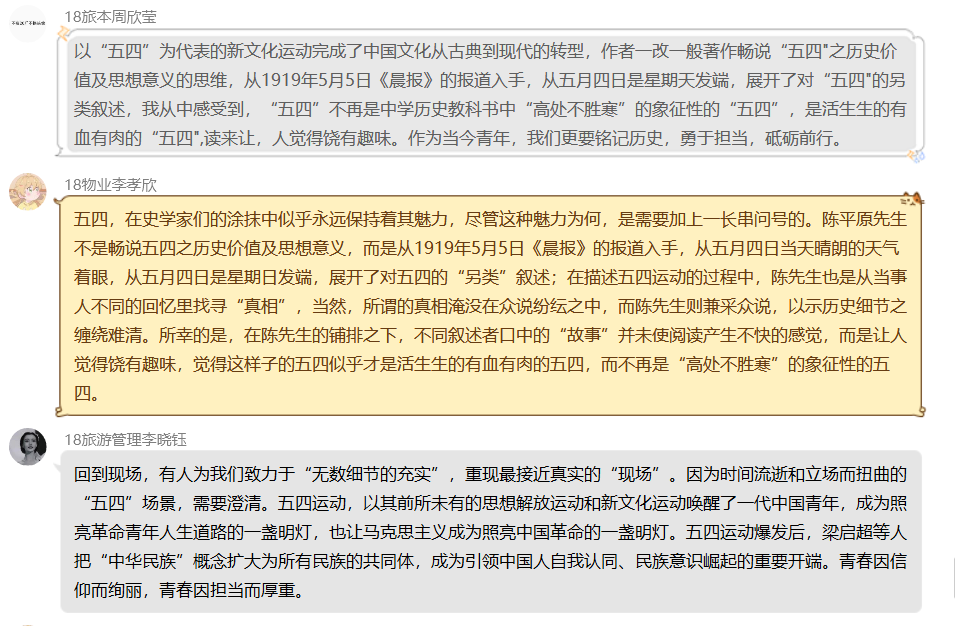 青学青习先锋队选取《触摸历史与进入五四》一书,进行线上读书分享会,以文言思、以言明志,号召青年学子自强不息。此次分享会引导广大团员青年缅怀五四先驱崇高的爱国之志和革命精神,呼吁大家在实现中华民族伟大复兴的接力跑中贡献一己之力,以饱满的热情、扎实的行动,展现新时代中国青年的爱国之情、责任与担当。