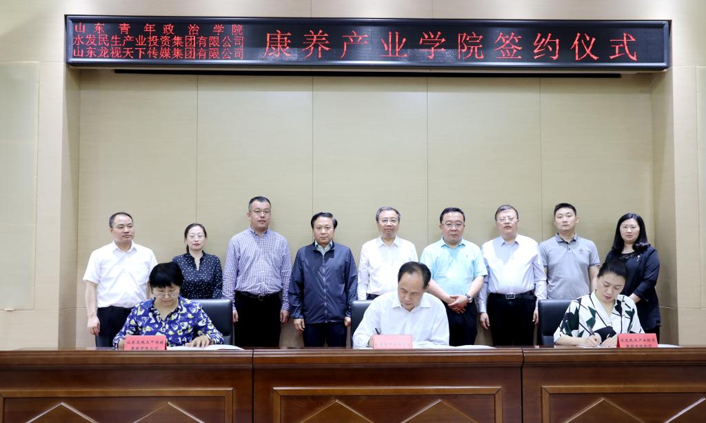为深入贯彻落实党的十九届四中全会关于养老事业发展的决策部署,结合山东康养产业和高等教育高质量发展的要求,按照国家推动产教融合的政策导向和省部共建职业教育创新发展高地的有关要求,5月17日上午,山东青年政治学院与水发民生产业投资集团有限公司、山东龙视天下传媒集团有限公司在山东青年政治学院共同签署了三方合作创建“康养产业学院”的框架协议。水发民生产业投资集团有限公司董事长兼总经理牛犇、副总经理李菁,山东广电传媒集团组建筹备工作组副组长张晶辉,山东龙视天下传媒集团副总经理赵瑞,山东青年政治学院党委副书记、院长张书明,副院长陈雨海和三方相关人员出席签约仪式。仪式由山东青年政治学院现代服务管理学院院长杨文凯主持。