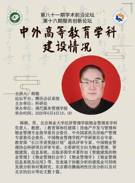 6月4日晚,我校第八十一期学术前沿论坛暨第十六期服务创新论坛顺利举行。北京林业大学物业管理学科负责人韩朝教授作了题为《中外高等教育学科建设情况》的学术报告。本次活动通过腾讯会议平台举行,由现代服务管理学院副院长尹洪禄主持,学院全体教师及部分学院教师代表在线参加了活动。