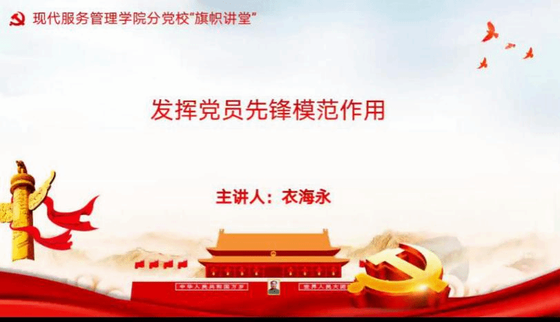 第一环节,衣海永围绕“发挥党员先锋模范作用”这一主题,从“什么是共产党员的先锋模范作用”、“抗疫战线对党员先锋模范作用的新要求”和“大学生党员如何发展党员先锋模范作用”三个方面展开讲述。他指出,党员发挥先锋模范作用,要在生产、工作、学习和一切社会活动中,通过自己的骨干、带头和桥梁作用,影响和带动周围的群众共同实现党的纲领和路线。他强调,一个党员就是一面旗帜,一个支部就是一座堡垒,在战“疫”的关键时期,对于广大党员提出了政治合格、执行纪律合格、品德合格、发挥作用合格等基本要求,也涌现出了一些感人事迹。学生党支部全体成员、入党积极分子要坚守政治合格根本要求、执行纪律合格基本底线,以“抗疫精神”奋力书写青年人的“诗和远方”。