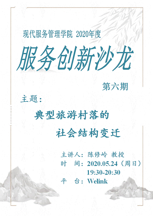 近日,学院2020年度第六期服务创新沙龙通过Welink平台在线举行。本期沙龙主题为“典型旅游村落的社会结构变迁”,由旅游管理教研室陈修岭教授主讲,学院30余名教师在线进行了交流研讨。