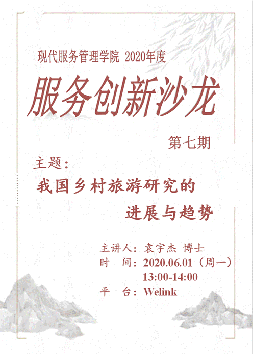 近日,我院2020年度第七期服务创新沙龙通过Welink平台在线举行。本期沙龙主题为“我国乡村旅游的进展与趋势”,由旅游管理教研室袁宇杰博士主讲,孙晟博士主持,学院30余名教师在线进行了交流研讨。