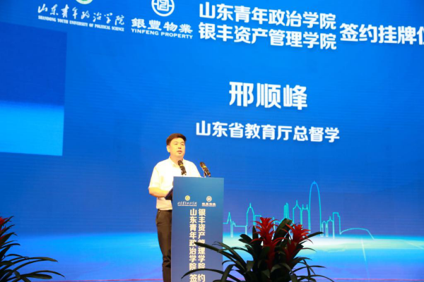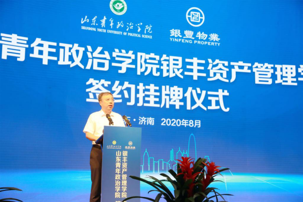 2020年8月27日上午,山东青年政治学院、银丰物业集团合作创建的山东青年政治学院银丰资产管理学院挂牌成立。山东省教育厅总督学邢顺峰,山东省住房和城乡建设厅二级巡视员殷涛,中国物业管理协会高级顾问、中国物协人力资源发展委员会副主任委员兼秘书长、国家开放大学现代服务与不动产管理学院常务副院长翁国强,中国物业管理协会副秘书长、山东省物业管理协会常务副会长兼秘书长张立君,中国物业管理协会产学研专委会常务副秘书长廖月华,济南市住房和城乡建设局副局长张恒志等相关单位负责同志出席签约挂牌仪式。学院党委书记鹿林,党委副书记、院长张书明以及其他校领导,银丰集团董事长王伟,银丰物业集团董事长刘旭、总裁庞亚平以及校企双方相关人员参加活动。张书明主持签约挂牌仪式。