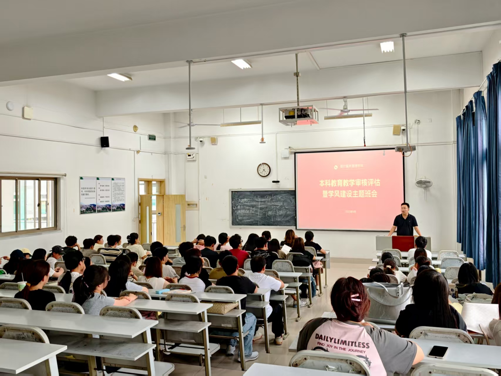 在行动上“拉满弓”,以协同攻坚汇聚学风建设合力。为确保活动组织有序、成效显著,学院立足不同群体特点,分层推进,全面营造积极向上的迎评氛围。学生层面,坚持骨干引领与班级全覆盖相结合。聚焦班长等核心学生骨干开展专项培训,再由辅导员牵头、骨干辅助召开主题班会,讲解评估知识、行为规范与纪律要求,引导学生树立“主人翁”意识,以良好风貌迎接评估;教职工层面,坚持集中学习与教研深耕并重。在学院统一部署与动员基础上,各教研室围绕课程体系、教学大纲、课堂规范、毕业设计、质量保障等核心指标深入研讨,确保教师将评估要求融入日常教学科研;个人层面,构建线上线下互补、集中与自学协同的学习机制。及时下发电子版《应知应会学习手册》,并利用网站、微信公众号推送资料,鼓励师生利用碎片时间自学,确保知识入脑入心。