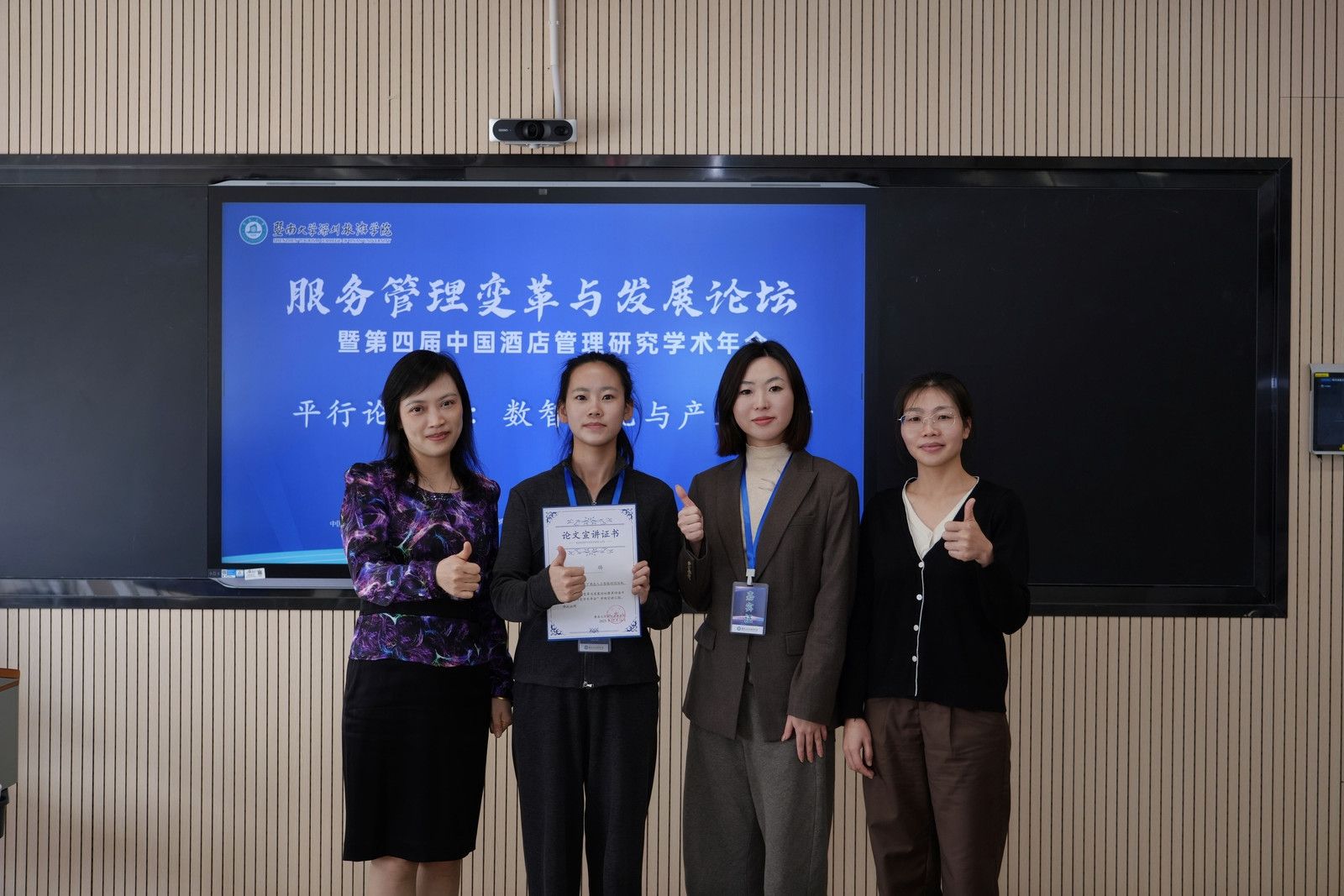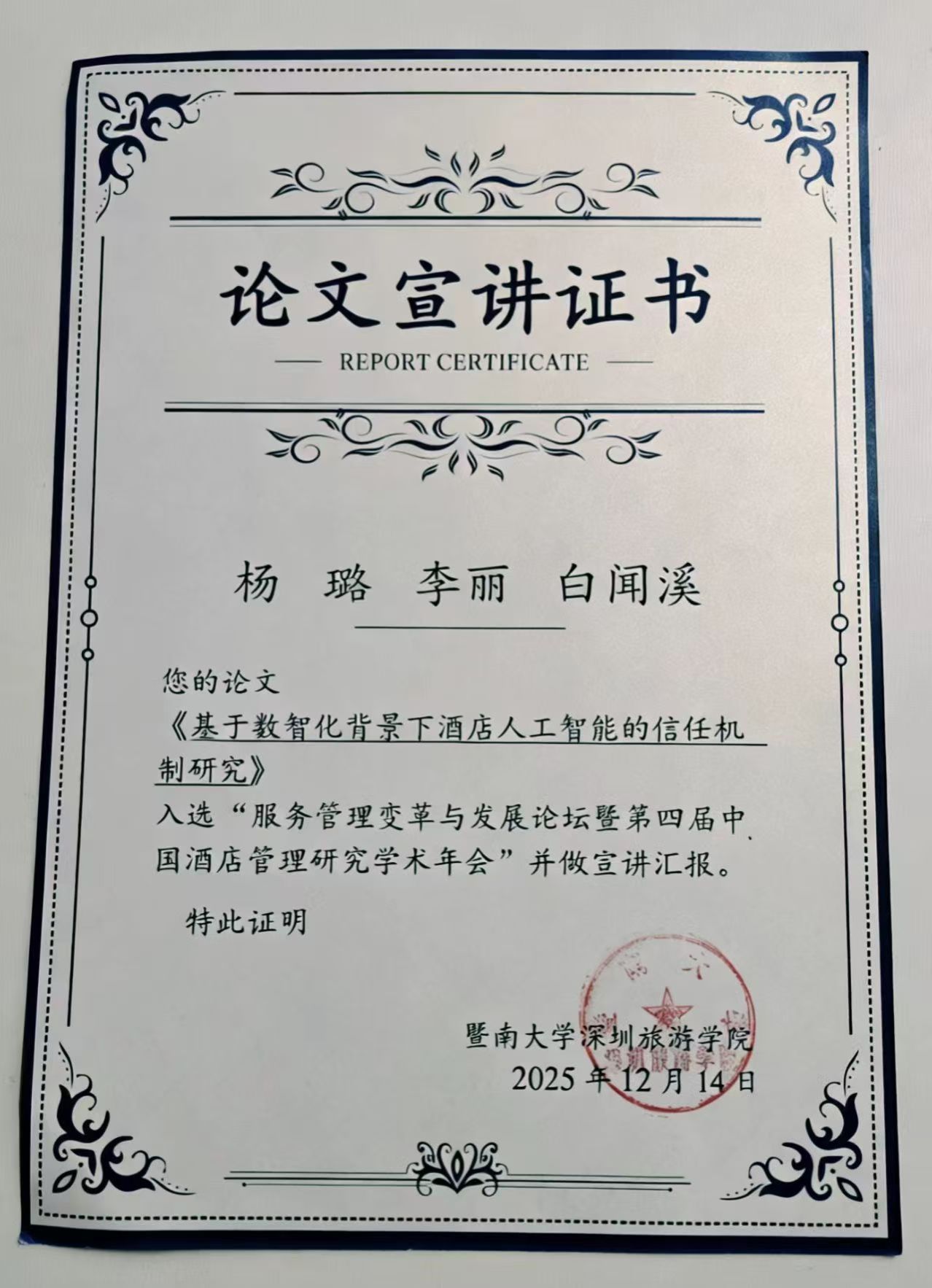 在“数智赋能与产业创新”平行论坛上,2025级酒店管理本科生杨璐同学以《基于数智化背景下酒店人工智能的信任机制研究》为题进行学术汇报。该研究由李丽院长与白闻溪老师联合指导,聚焦人工智能在酒店业应用中的信任构建难题。杨璐同学通过理论模型构建与实证设计,系统分析了酒店人工智能信任的多维影响因素,其研究成果在互动环节获得评审专家“视角新颖、逻辑严谨”的高度评价,并获颁论坛宣讲证书。这一成果不仅彰显了我院学生扎实的专业功底与前沿意识,更体现了“学术训练+行业实践”双轮驱动的育人成效。
