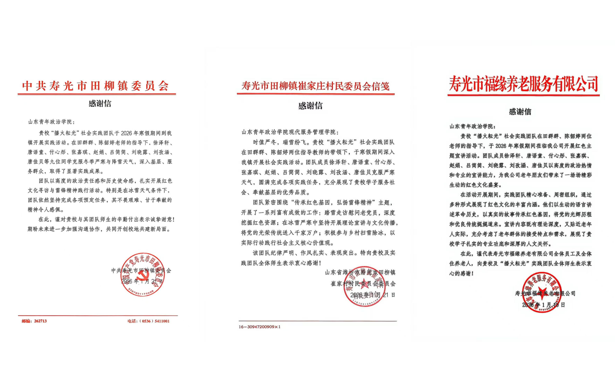 实践期间,现管师生深入基层、躬身实践,累计形成调研报告70余份,收到来自地方政府及实践单位的3封感谢信,以扎实成效展现专业素养与青春担当。下一步,学院将持续深化实践育人体系建设,推动社会实践成果反哺课堂教学,在知行互哺中打造具有山青特色的实践育人品牌,为培养堪当重任的时代新人贡献现管力量。