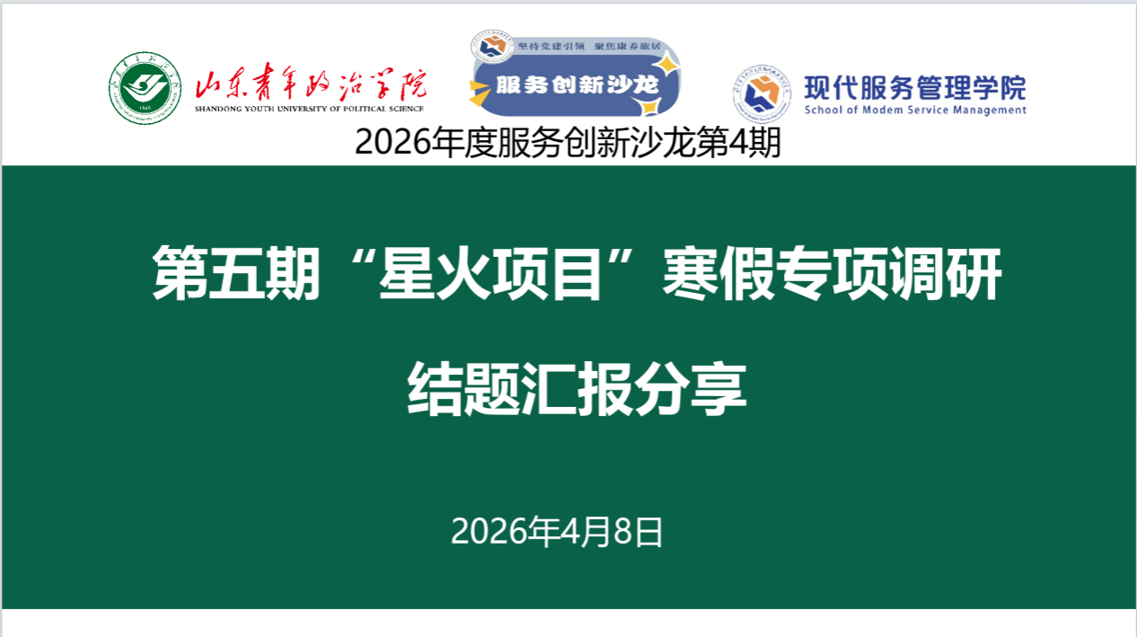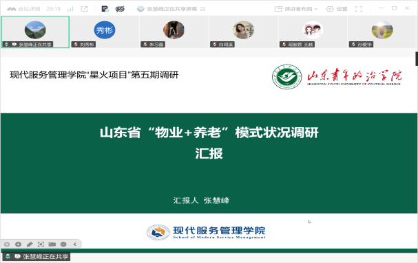 4月8日,现代服务管理学院召开2026年度第4期服务创新沙龙暨第五期“星火项目”寒假专项调研结题汇报分享会。活动以线上方式进行,各调研项目负责人与团队成员共20余人参会,学院教学科研办公室主任刘秀彬主持。会议围绕文旅融合、黄河文化遗产、康养专业建设、夜间经济、物业+养老等主题进行集中汇报与交流研讨。