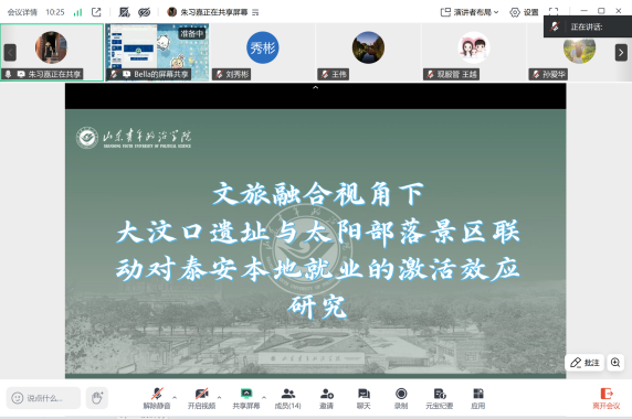 会上,各项目团队依次汇报调研成果、核心发现、实践对策与后续研究计划。汇报内容紧扣区域发展与学科前沿,涵盖大汶口遗址与太阳部落文旅联动就业效应、济南夜市中青年消费体验、山东省“物业+养老”模式、黄河流域(济南段)文化遗产保护体系、全国康养类本科专业设置图谱等课题,研究数据扎实、问题剖析深刻、对策建议务实,充分体现了“扎根地方、服务产业、学以致用”的调研导向。